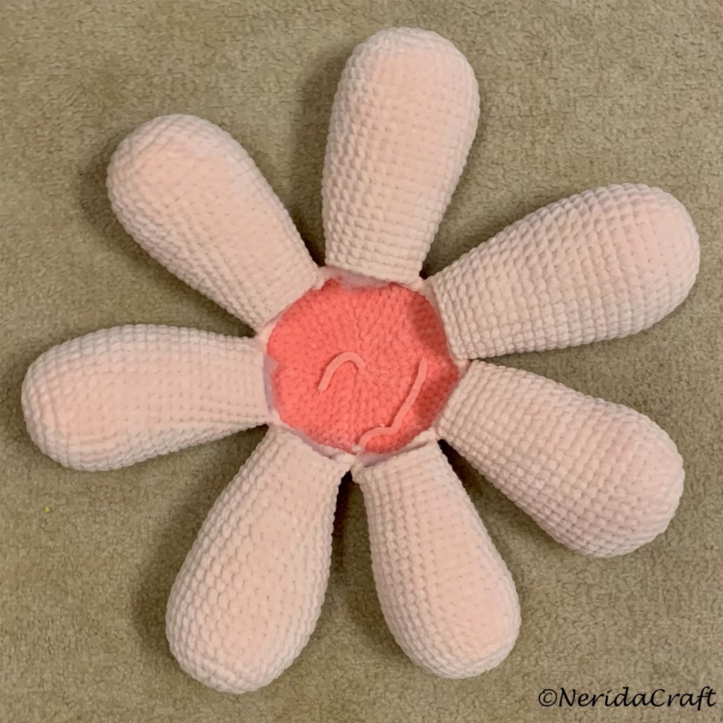 Close with an slst, stuff, fasten off, leaving a tail for sewing (or may use a different worsted yarn to sew them all to the middle part when finished with all the petals). Sew the first 10 stitches to the first 10 stitches of the middle (with right sides facing together). Sew all the other petals one by one to the coming 10 stitches of the same middle part.